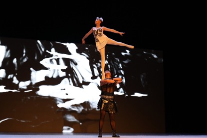 月色幽幽、舞影綽綽,中國雜技團高學峰、李陳長青表演的雜技《芭蕾對手頂 邀月弄影》將東方的雜技與西方的芭蕾完美結合,使優雅的芭蕾平添了神奇的魅力。