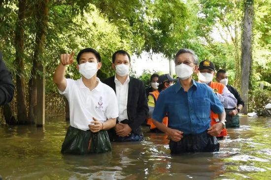 泰國國會主席川立派閣下、伊沙拉國會議員、信武里府尹等步行或乘船赴災區第一線