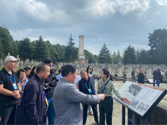 英魂無言,松濤陣陣。在松山抗戰遺址,采訪團一行向抗戰英烈敬獻鮮花,懷著激動的心情探訪了目前保存最為完好的二戰戰場遺址。松山戰役紀念碑前的中國遠征軍雕塑群由老兵方陣、娃娃兵方陣、炮兵方陣等13個雕塑方陣402座雕塑組成,古榕樹上還保留著當年的彈孔,向今天的人們訴說著當年戰役的慘烈。“我在參觀中國遠征軍雕塑群時,巧遇一名穿著粉色衣服的女孩穿梭于娃娃兵方陣里,給塑像手里塞糖果。我看到在龐大的方陣里,塑像的手里、腳下,甚至是‘槍托’里,都塞滿了五顏六色的糖果和零食。我想,這包含的不僅是人們對抗戰英雄們的緬懷,更多的是心疼,他們用最直接和最質樸的行動在訴說著和平年代的人們對這些先烈們的感激之情。”采訪團成員、尼日利亞西非統一商報副社長王淑華感動地說道。