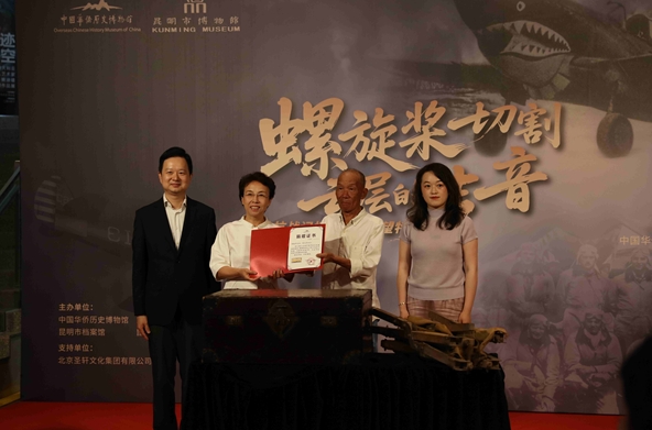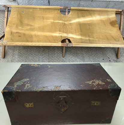 7月4日,在“螺旋槳切割云層的聲音——飛虎隊歷史記憶與和平守望特展”開幕式上,南僑機工郭六成使用過的行軍床和皮箱入藏僑博,中國僑聯副主席程紅為郭六成之子郭振華和孫女郭文麗頒發捐贈證書。據介紹,這張特殊的行軍床是郭六成在滇緬公路上隨車攜帶的物品。平時,它是機工們休息的床;不用時,可折疊起來放在車上;情況緊急時,還能變成簡易擔架。床上洗不掉的血漬和斑痕,仿佛在訴說著郭六成和機工們翻山越嶺、為保持運輸大動脈暢通而嘔心瀝血的過往。