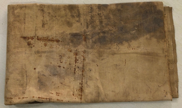 由于行車時間長、路況差、運載重,加上經常遭遇日機追擊掃射甚至狂轟濫炸,機工們開的車常會發生故障。除極少數嚴重損壞外,絕大部分車輛需要就地緊急搶修。不論身處何地,也不論什么路況,車一旦拋錨,機工就需要迅速拿起工具包,將修車帆布往車底一鋪,鉆入車底檢修,并將拆下的零部件小心放在帆布上,使其不被塵土侵染,保證搶修后車輛的正常運轉。時間一長,零部件上的機油就滲透在這塊帆布上,留下大小不一的斑塊。這些斑痕成了那段歷史遺存的痕跡。利漢平在1949年回到梅縣時,把這塊帆布墊留在了老家,他的兒子利果林后來一直使用并將其保存下來,并于近日捐贈給僑博。
