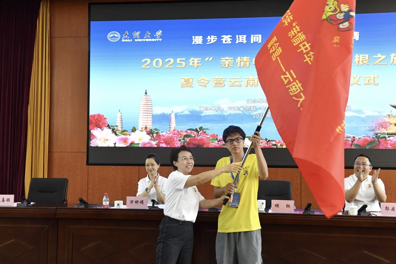 29日上午,2025年“親情中華·中國尋根之旅”夏令營云南大理營在大理大學舉行開營儀式。來自美國、法國、德國、西班牙、俄羅斯、荷蘭、葡萄牙、加拿大等8個國家的85名華裔青少年,中國僑聯、云南省僑聯、大理大學、大理州僑聯、大理市僑聯相關人員,以及相關媒體參加了開營儀式。儀式上,程紅副主席為營員代表授旗。