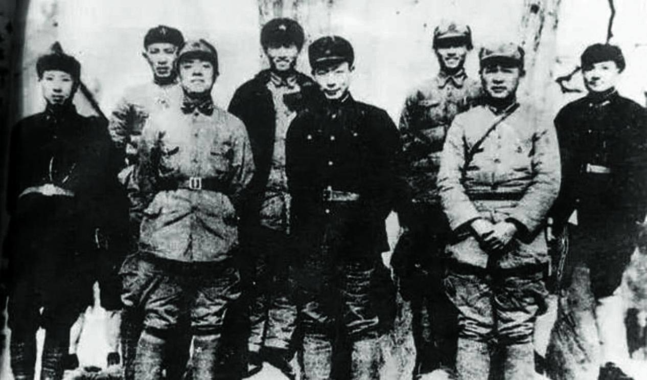 紅一方面軍、紅十五軍團(tuán)部分領(lǐng)導(dǎo)在陜北合影。前排左起:王首道、楊尚昆、聶榮臻、徐海東;