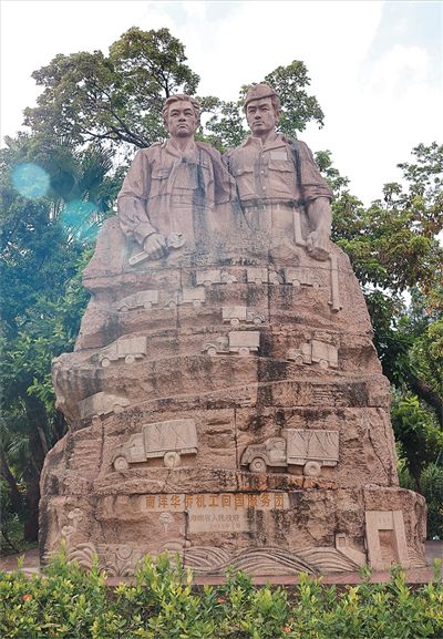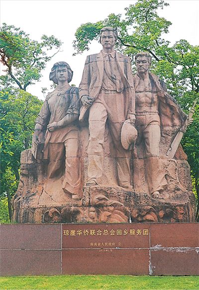 位于海口青少年活動中心廣場的“瓊崖華僑聯合總會回鄉服務團”雕塑。本報記者 孫海天攝