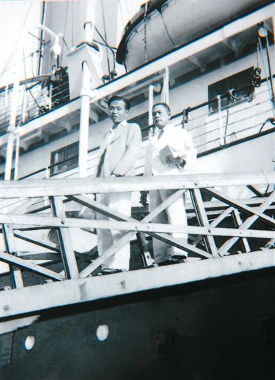 1939年6月初,符克率越南瓊崖華僑回鄉服務團42名團員,乘輪船取道香港回瓊參加抗戰。圖為符克(左)在輪船上留影。資料圖片(受訪者提供)