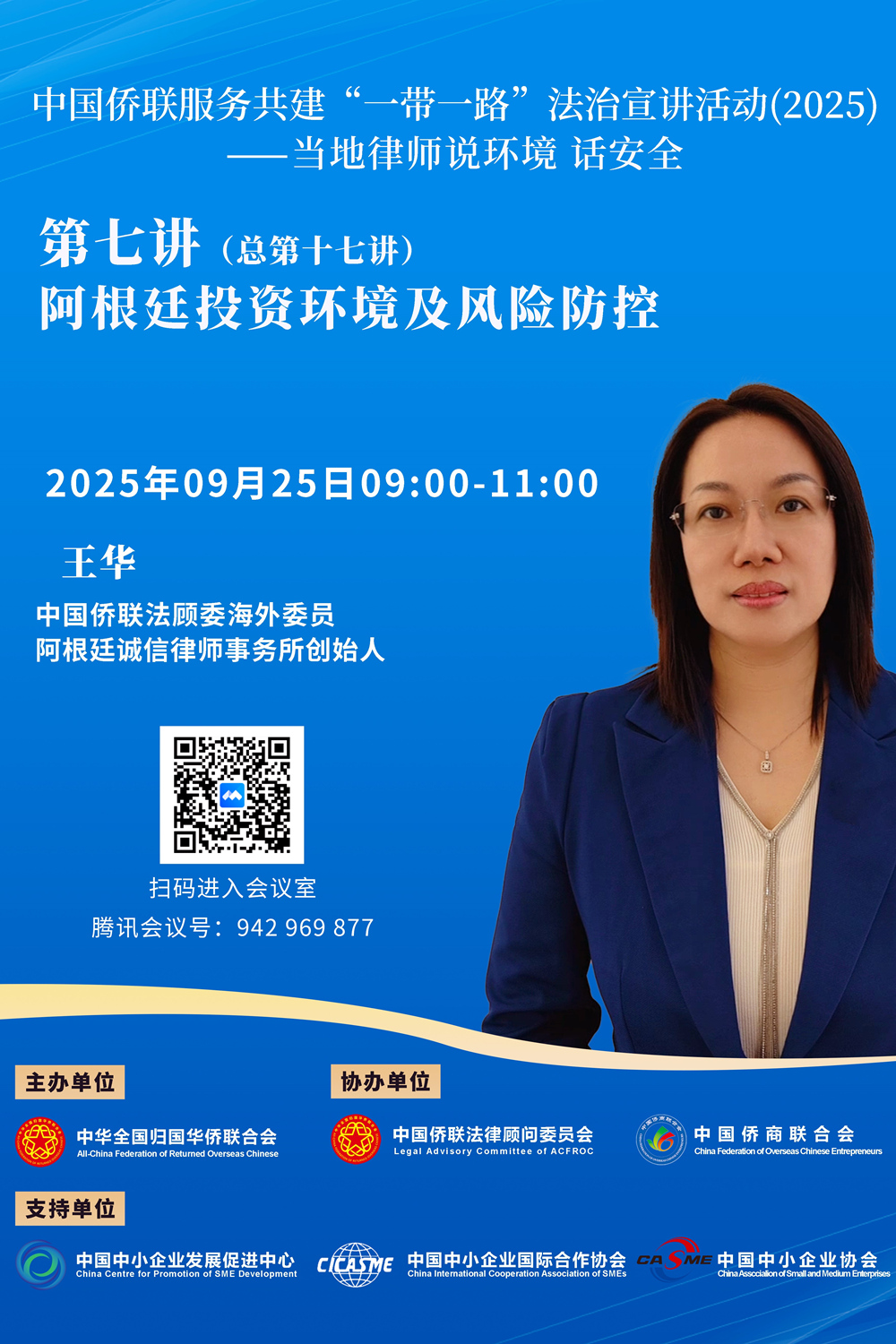 今年第七講(總第十七講)將于2025年9月25日(周四)9:00開播,由中國僑聯法顧委海外委員阿根廷王華律師主講。王律師畢業于阿根廷美洲大學,獲得國際貿易碩士學位,持有律師執照和阿根廷國家公認中西文翻譯資格證。王律師專注于公司法、海關法、國際貿易和移民法等,近年來在中資企業投標、重組、并購、索賠、公證等方面提供全方位法律服務,助力中資企業“走出去”。王律師還同時兼任阿根廷華僑華人婦女聯合總會會長、中國駐阿根廷大使館領事部法律顧問、阿根廷布宜諾斯艾利斯大學法學院特聘教授等職務。