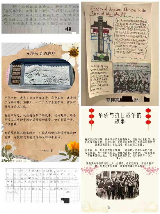 “在抗日戰爭時期,許多華僑雖然身在海外,但始終心系祖國。他們積極籌集資金,捐款捐物,支持中國的抗戰。有些年輕的華僑甚至回到祖國,參加戰斗,用生命保衛家園”,來自泰國絲路國際教育的怡同學表示,“這些海外華僑的行動讓人十分感動。他們證明了,不論身在何處,只要心中有祖國,就能成為真正的英雄。”泰國絲路國際教育的李同學說:“我們要記住華僑對祖國的貢獻,也提醒我們要珍惜今天的和平生活。”意大利新玉語言學校林同學表示:“我要學習他們團結和愛國的心,現在好好讀書,將來也要為祖國作貢獻!”