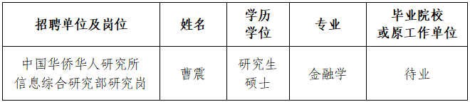 中國華僑華人研究所學術交流研究部研究崗因人選放棄考察資格,取消招聘計劃;理論政策研究部研究崗因人選不符合招聘要求,取消招聘計劃。