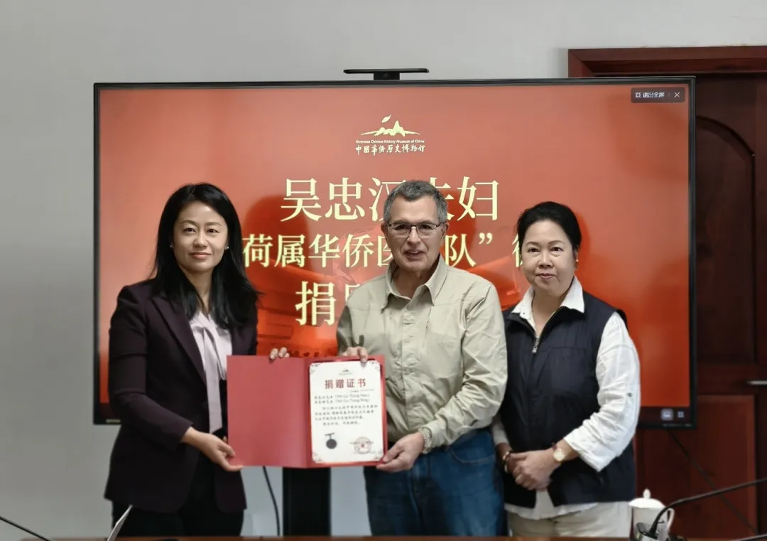 11月4日上午,抗戰(zhàn)時(shí)期“荷屬華僑醫(yī)療隊(duì)”隊(duì)長(zhǎng)吳云燦之子吳忠漢與夫人劉美英一行,從荷蘭專程來(lái)華,到訪中國(guó)華僑歷史博物館,捐贈(zèng)吳云燦生前佩戴的荷屬華僑醫(yī)療隊(duì)徽章,將這份承載著華僑愛(ài)國(guó)情懷的歷史信物交付博物館珍藏。中國(guó)華僑歷史博物館副館長(zhǎng)雷霆接受捐贈(zèng),并為吳忠漢夫婦頒發(fā)捐贈(zèng)證書(shū)。