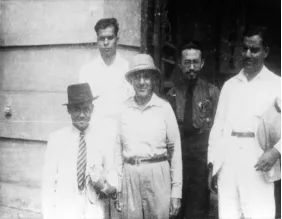 左圖為吳云燦(右二)與出發(fā)去延安的印度醫(yī)療隊(duì)合影;右圖為荷屬華僑醫(yī)療隊(duì)徽章