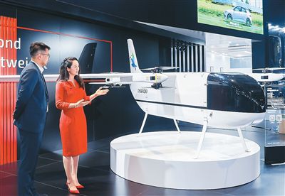 圖為在第八屆進博會上,亨睿碳纖維市場總監陳文瑾(右)向觀眾介紹中型電動垂直起降物流無人機 LEU100真機。