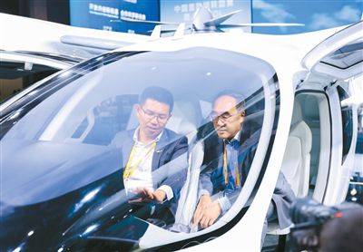 圖為在第八屆進博會上,黃雍威(左)在E20 eVTOL全尺寸真機內為觀眾作講解。