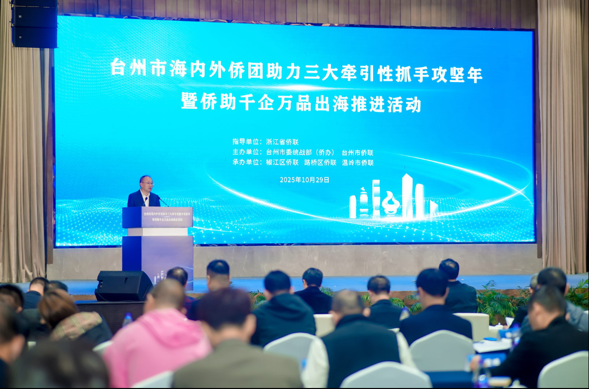 10月29日,臺(tái)州市海內(nèi)外僑團(tuán)助力三大牽引性抓手攻堅(jiān)年暨僑助千企萬品出海推進(jìn)活動(dòng)隆重舉行。中國僑聯(lián)經(jīng)濟(jì)科技部副部長祁德貴,臺(tái)州市委常委、統(tǒng)戰(zhàn)部部長苗文斌出席活動(dòng)并致辭。臺(tái)州市有關(guān)部門代表以及海內(nèi)外僑團(tuán)負(fù)責(zé)人、臺(tái)州市僑商會(huì)代表、臺(tái)州市留聯(lián)會(huì)代表等100余人參加活動(dòng)。