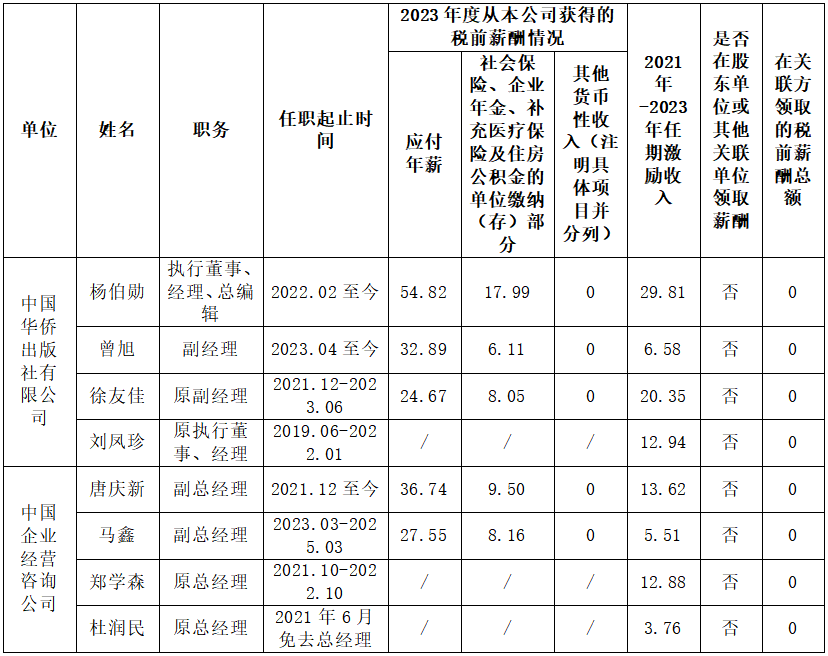 備注:上表披露為我會所屬企業(yè)負(fù)責(zé)人2023年度全部應(yīng)發(fā)稅前薪酬(不含發(fā)放的以往年度績效年薪)。