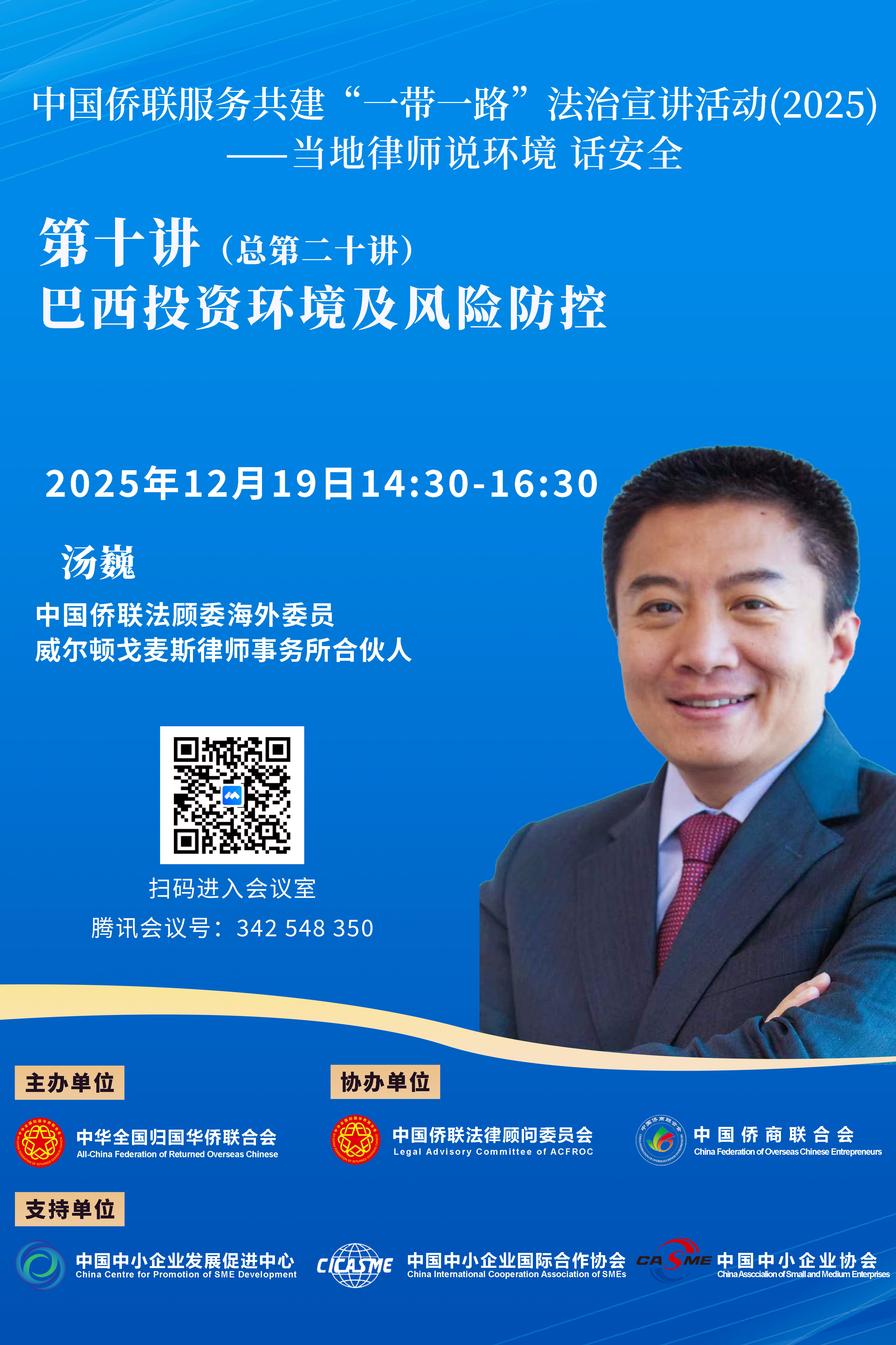 今年第十講(總第二十講)將于2025年12月19日(周五)14:30開播,由中國僑聯(lián)法顧委海外委員巴西湯巍律師主講。湯巍律師畢業(yè)于巴西圣保羅大學法學院,在巴西從事律師工作二十余年,精通巴西民法、公司法、行政法,尤其在外商投資、國際貿(mào)易及基礎(chǔ)設(shè)施建設(shè)等領(lǐng)域擁有深厚造詣。湯律師同時在巴西華人協(xié)會、巴西廣東同鄉(xiāng)總會等多家僑團擔任重要職務(wù),致力于為巴西當?shù)厝A人華僑、中資企業(yè)及中國駐巴西使領(lǐng)館提供專業(yè)法律服務(wù)。